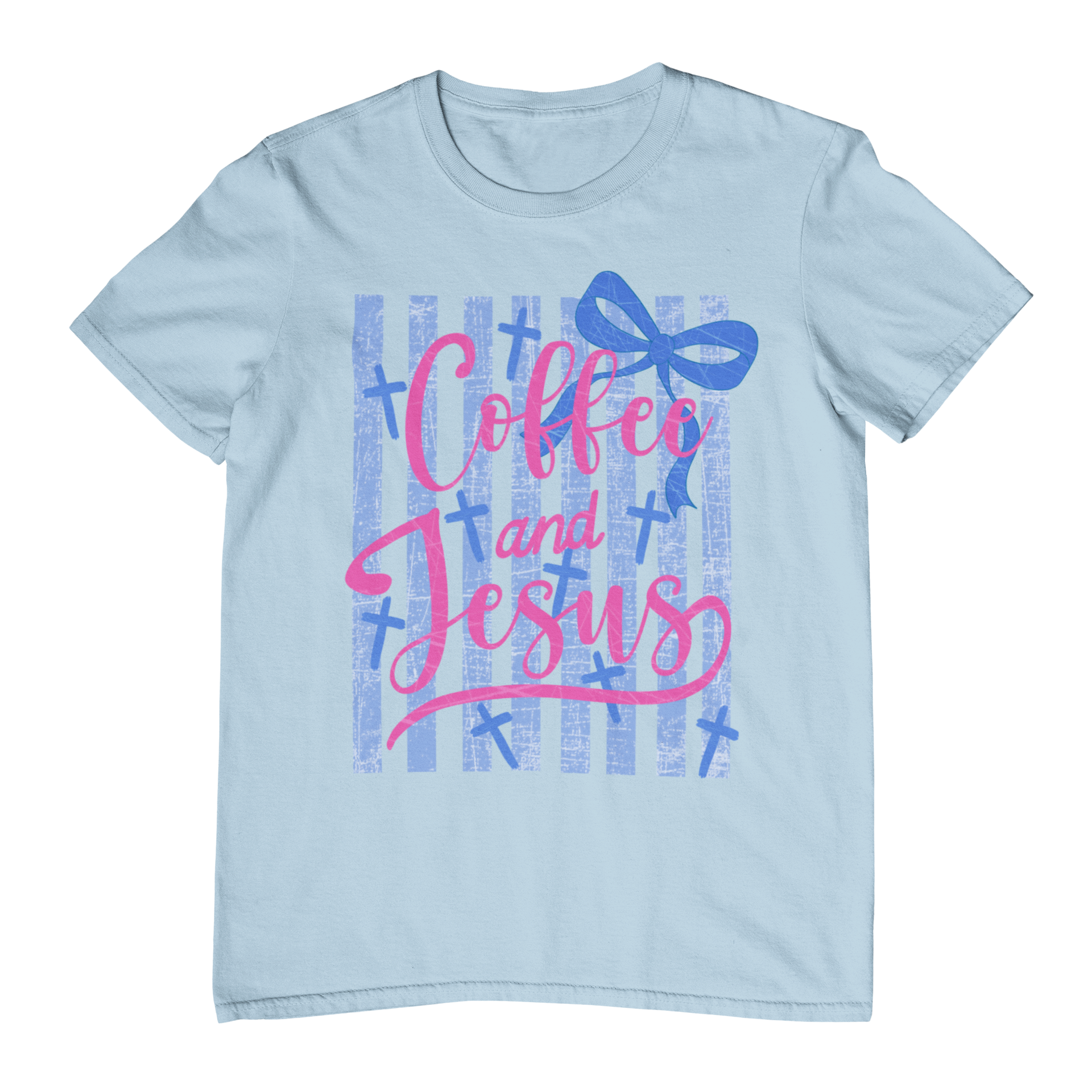 This sweet and cheerful design says it all “Coffee and Jesus.” Set against soft blue vertical stripes with subtle cross accents, the bright pink script lettering pops beautifully on the tee. A playful blue bow at the top adds the perfect girly touch, giving it a fun, boutique-style feel. It’s cozy, uplifting, and full of personality made for the girl who starts her mornings with a little caffeine and a lot of faith. Easy to dress up with a cardigan or keep casual with your favorite jeans, this one just feels happy and heartfelt all at once. 💗✨
